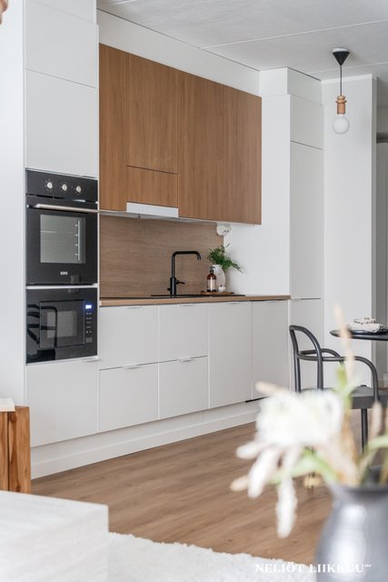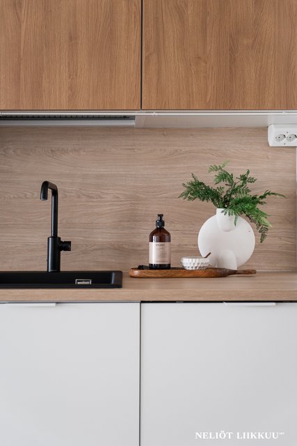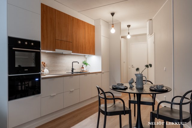 - Keittiön varusteet: Integroitu jääkaappipakastin (Grundig), integroitu astianpesukone (Senz), erillisuuni (Senz), induktiotaso, integroitu mikroaaltouuni (Point 3), liesikupu (Vallox Delico KTD), kiinteät valaisimet, laminaattitasot (Tammi natur). Komposiittiallas, Damixa-hana (silhouet mattamusta), vetiminä Lungo valkoinen, Oviko keittiö. Keittiön pintamateriaalit: välitilalaminaatti (Tammi natur), vinyylilattiat (Kermos Creme Oak) ja seinät maalatut.