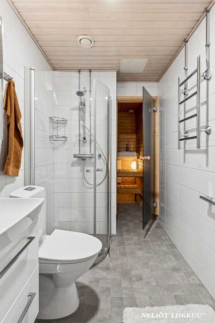 Asunnon oma sauna tarjoaa rentouttavat löylyt arjen keskellä. Säilytystilat ovat erinomaiset vaatehuoneen ja eteisen kaapistojen ansiosta. Siisti ja moderni kylpyhuone viimeistelee kokonaisuuden.