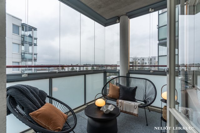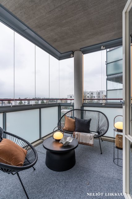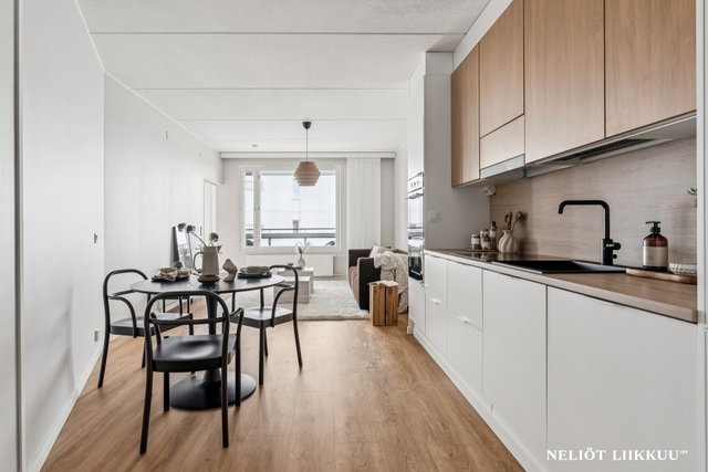 Valoisa olohuone avautuu lasitetulle parvekkeelle, joka lisää asumistilaa ja mahdollistaa parvekkeen käytön pitkälle syksyyn. Tehokkaasti suunniteltu keittokomero on päivitetty vastaamaan nykyajan tarpeita ja tarjoaa hyvät puitteet ruoanlaittoon.