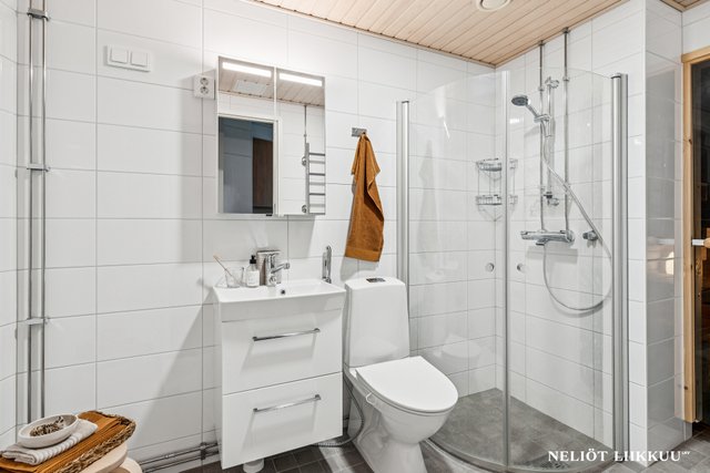 - Kylpyhuone remontoitu vuonna 2021 taloyhtiön toimesta. Kylpyhuoneen varusteet: suihku, suihkuseinä, wc-istuin, peilikaappi, allaskaappi, bidee-suihku, pyyhkeenkuivauspatteri. Kylpyhuoneen pinta-materiaalit: Katto paneelia, seinät kaakelia ja lattiat laattaa.