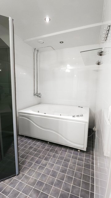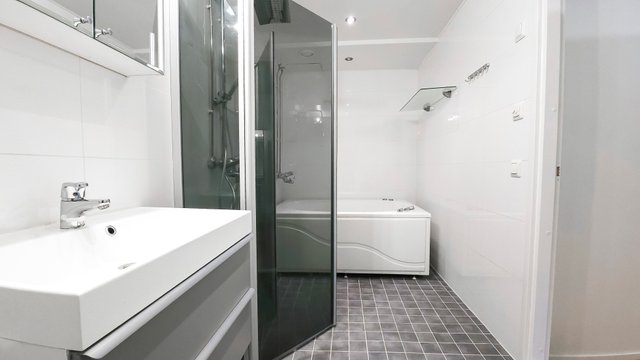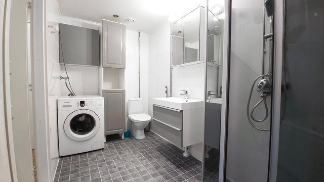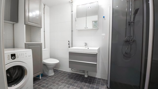 - Suihkuseinä, pesukoneliitäntä, allaskaappi, poreamme, wc-istuin, peilikaappi, ja kylpyhuonekaapit