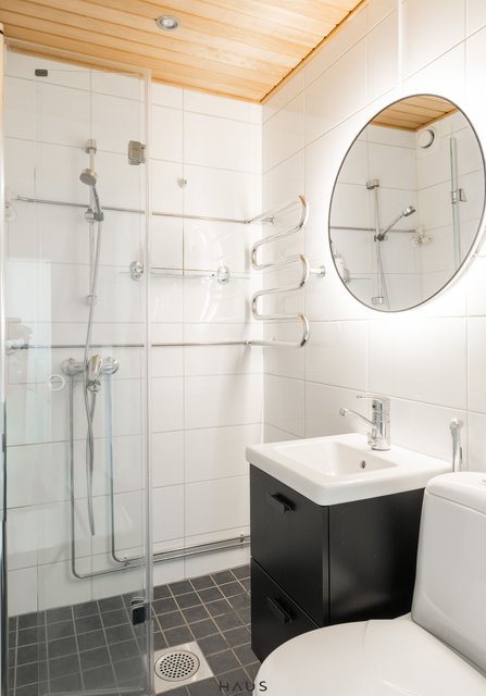 - WC-istuin, suihku, suihkuseinä, peili, allaskaappi, pesuallas, ja bidee-suihku