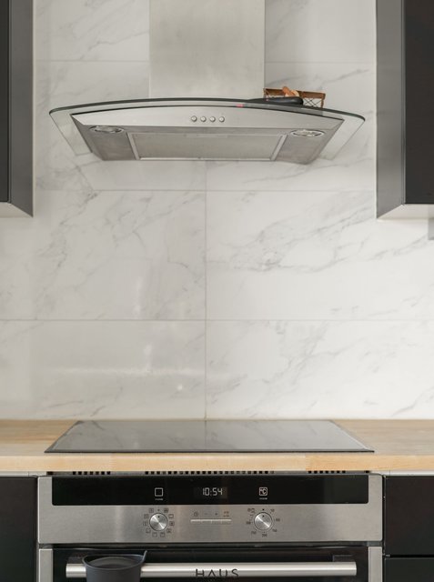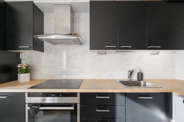 - Keittiön kaapiston ovet on pinnoitettu mustalla teippipinnoitteella. Varsinainen kaapisto on valkoinen ja ennallistettavissa uuden omistajan niin halutessaan.