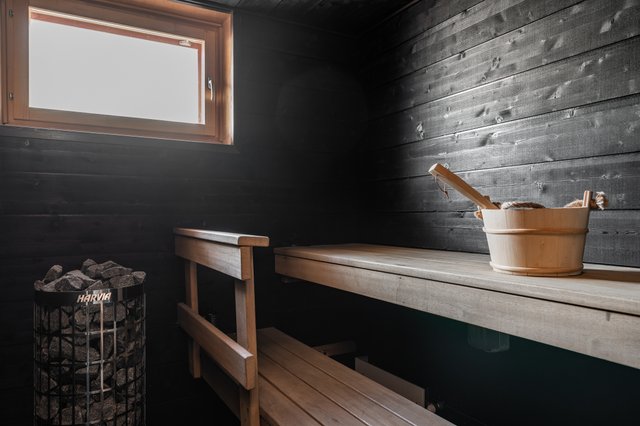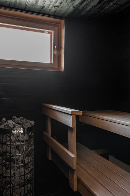 - VARUSTUS: Kiuas, Lauteet SEINÄT Puupaneeli LATTIA: Laatta