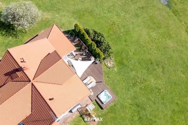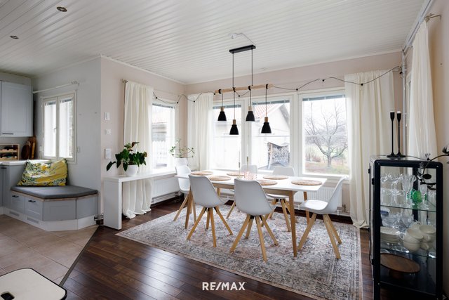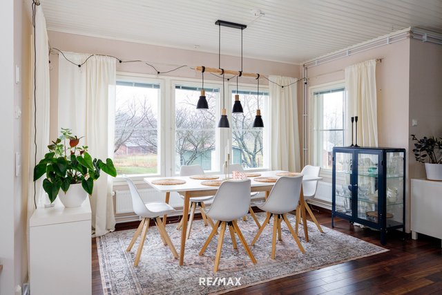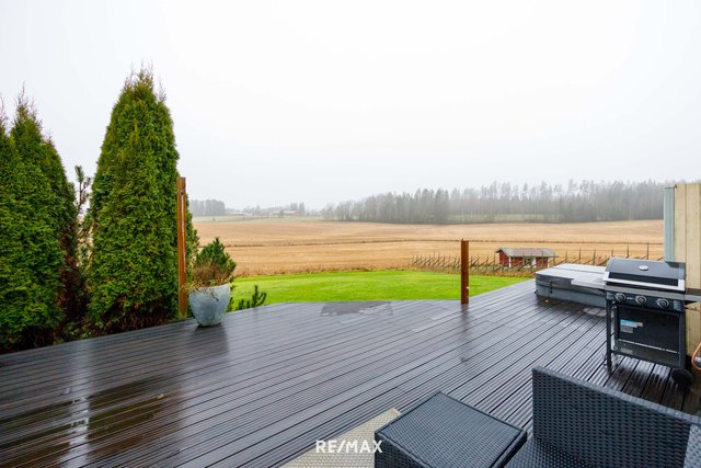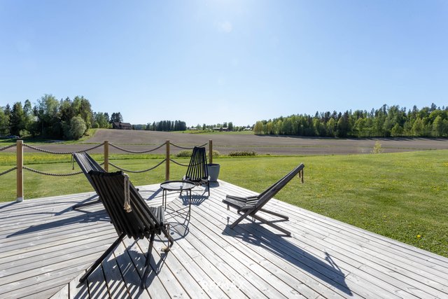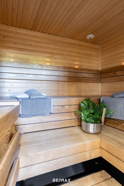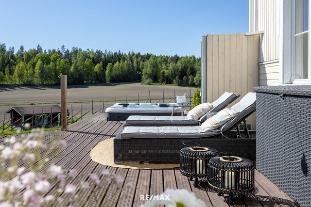 Talo on suunniteltu yhteisiä hetkiä varten. Avoimesti toisiinsa yhteydessä olevat keittiö, ruokailutila, olohuone sekä sen jatkeena oleva upea ja lasitettu terassi ovat toimiva kombo, missä pidät helposti isommatkin juhlat. Ulkosalla oleskeluun voit valita joko lasitetun terassin tai avoterassin auringossa. Löylyjen kautta ulos poreammeeseen ihastelemaan aurinkoa, tähtiä tai ympäröivää luontoa – aika monelle kelpaa. Yläkerrassa on mahtavasti tilaa ja aulan lisäksi neljä makuuhuonetta ja parveke. Talon keskiössä on varaava takka, joka yhdessä maalämmön ja ilmalämpöpumppujen kanssa takaa kohtuulliset lämmityskustannukset.