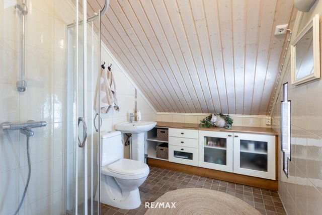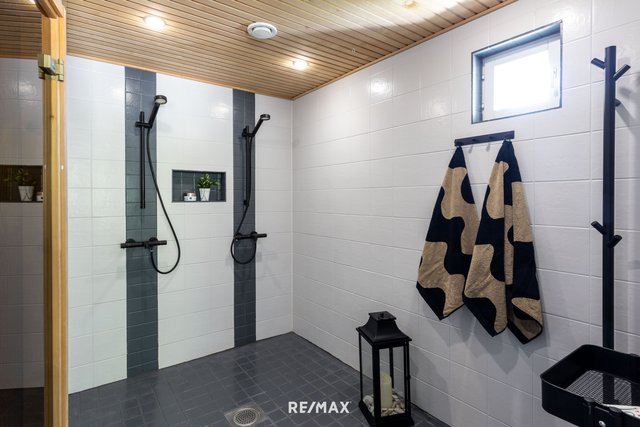 - ALAKERTA: Pesuhuone, missä kaksi suihkua ja ikkuna. Tilasta poistettu vanha poreamme ja varaus ammeelle edelleen olemassa. Sähkötoiminen rättipatteri. Kaakelit maalattu ja hanat sekä suihkut uusittu 2021. YLÄKERTA: Yläkerrassa on myös pesuhuone, jossa suihkukaappi, kaapisto, wc-istuin ja peili.