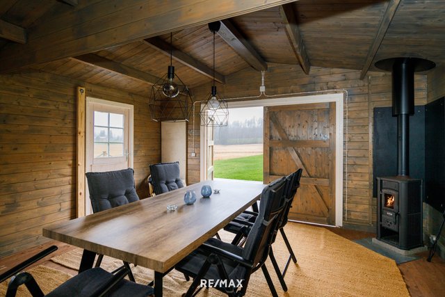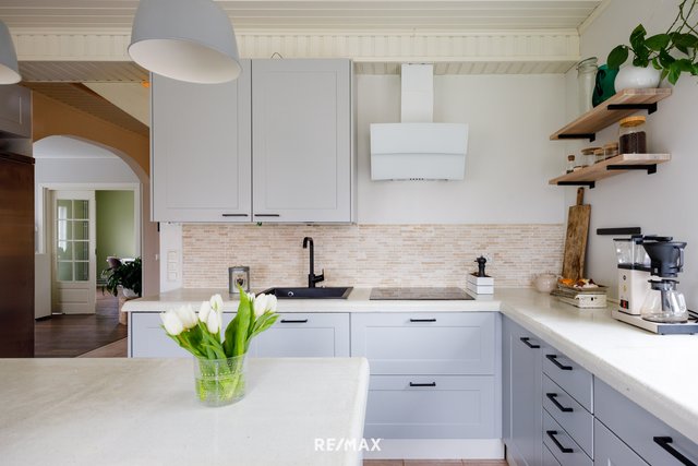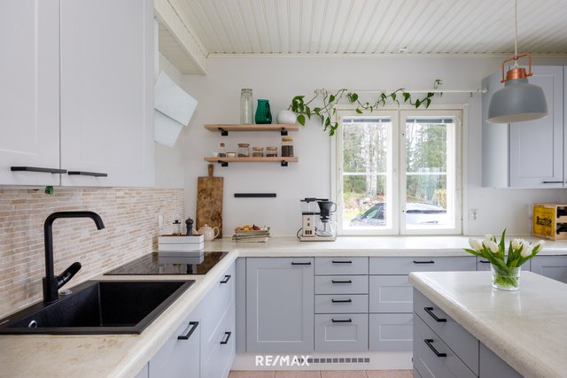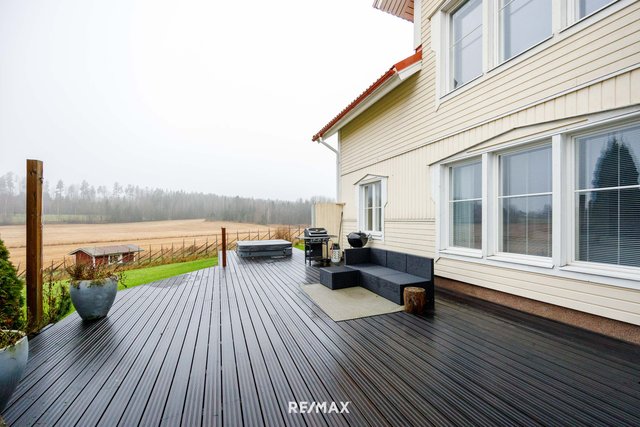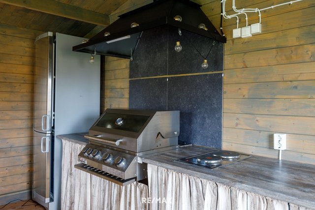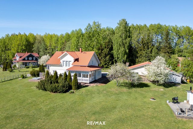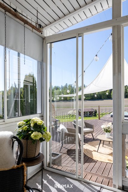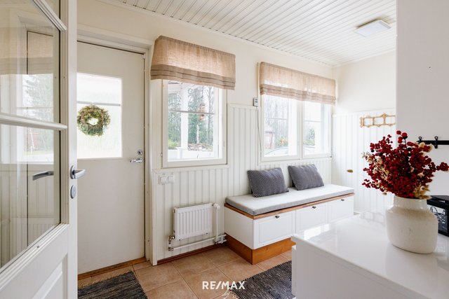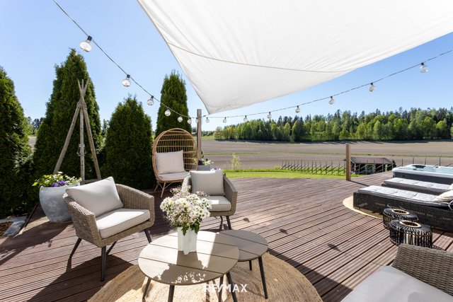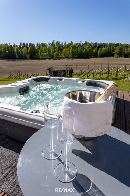 - Lasitetun terassin riippukeinu ja rullaverhot, verhotangot, kiinteät valaisimet ja keittiön saarekkeen päällä olevat kattovalaisimet, ulkoporeamme, sälekaihtimet, asennetut koukut ja naulakot, eteisen, kodinhoitohuoneen ja keittiön istuinpenkkien istuintyynyt. Kesäkeittiön kiinteä varustus. Autokatokseen asennettu sähköauton latausasema ( 10 kW). Polttopuut kuuluvat kauppaan