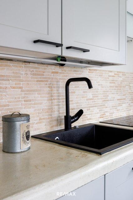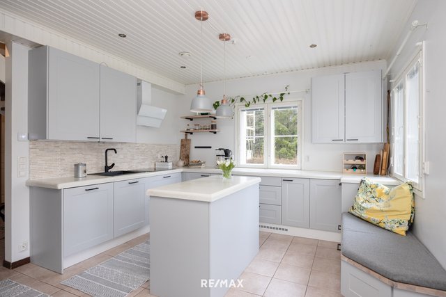 - Novillo. 2021 uusittu ja hyödynnetty vanhoja kaappirunkoja osittain alakaapistoissa. Seinähyllyt 2 kpl. Saareke (irrallinen, ehjä laatoitus alla). Istuinpenkki säilytyslaatikoilla.