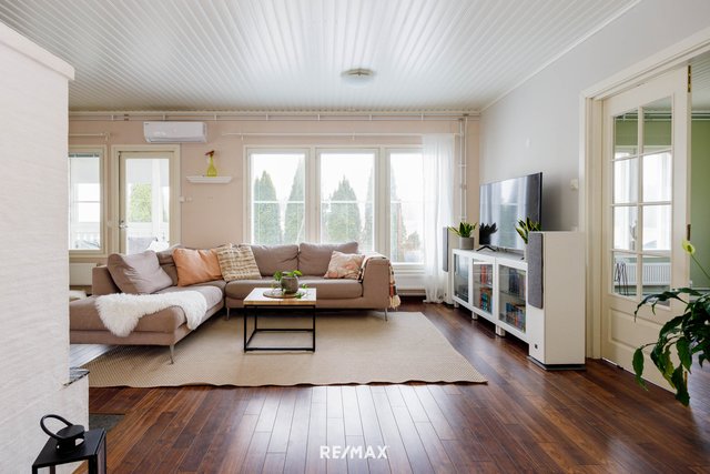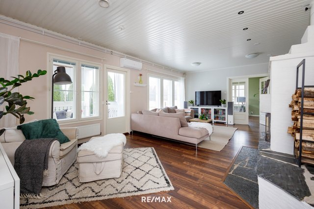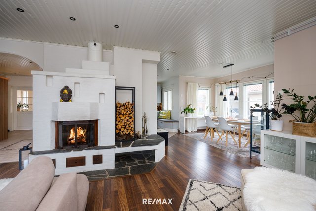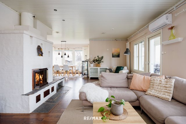 - Iso varaava takka. Kulku lasitetulle terassille. Ilmalämpöpumppu.