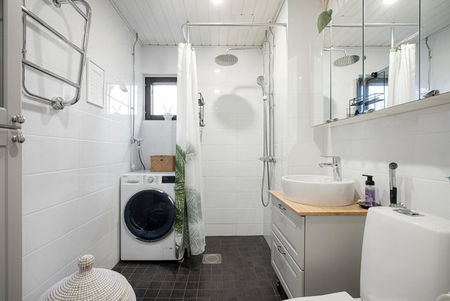 - WC-istuin, suihku, pesukoneliitäntä, allaskaappi, pesuallas, ja peilikaappi