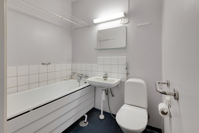 - WC-istuin, kylpyamme, pesukoneliitäntä, peili, ja suihku