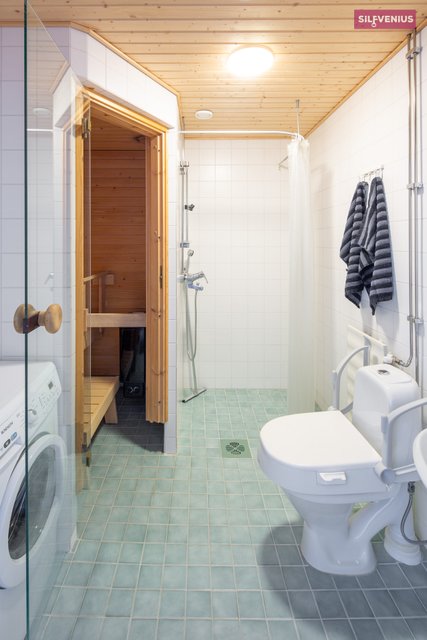 - WC-istuin, suihku, lattialämmitys, peilikaappi, pesuallas, ja pesukoneliitäntä