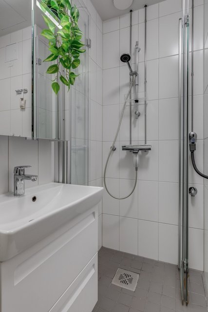 - Suihku, suihkuseinät, pkl, käsienpesuallas, käsisuihku, allaslaatikosto, peilikaappi, lattialämmitys