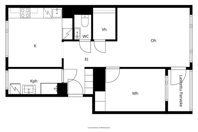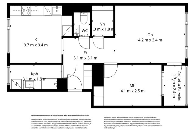 - Varustus: Induktioliesi, Liesituuletin, Uuni, Hana, Kaapisto, Allas, Astianpesukone, Jääkaappipakastin Seinämateriaali: Maali Lattiamateriaali: Parketti