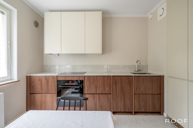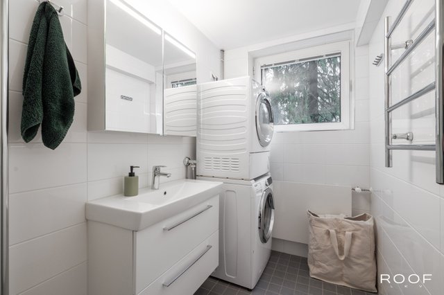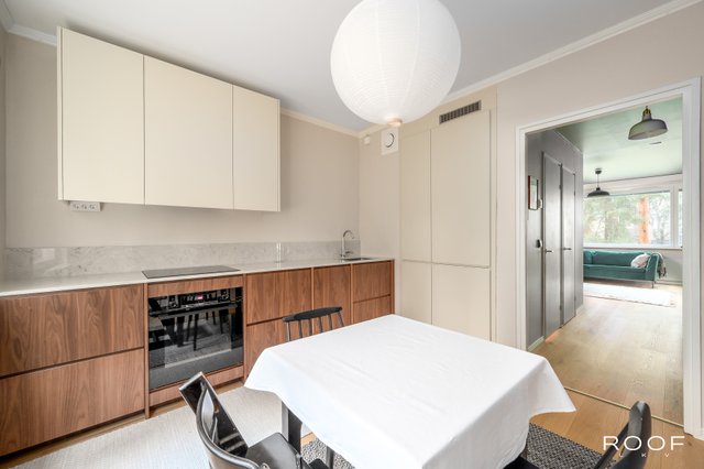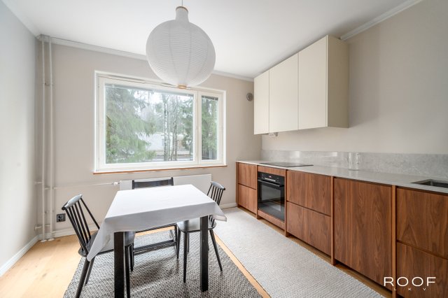 Keittiö sijoittuu omaan erilliseen huoneeseensa, ja ikkunan ääreen mahtuu luontevasti ruokapöytä. Vuonna 2023 uusittu keittiö tarjoaa toimivasti säilytys- ja laskutilaa, ja ilme on selkeä ja ajaton. Keittiön yhteydessä sijaitsee kylpyhuone, jossa on ikkuna sekä tilaa pyykkihuollolle.