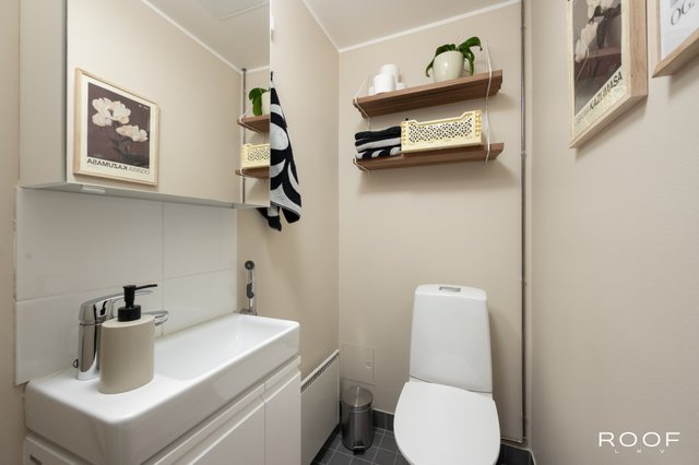 - Varustus: Suihku, Suihkuseinä, Pesukoneliitäntä, Hana, Allas, Peilikaappi, Allaskaapisto, Lattialämmitys, Rättipatteri Seinämateriaali: Laatta Lattiamateriaali: Laatta
