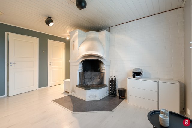 Takkahuoneessa on tunnelmallinen takka, joka luo lämpöä ja viihtyisyyttä talvi-iltoihin.
