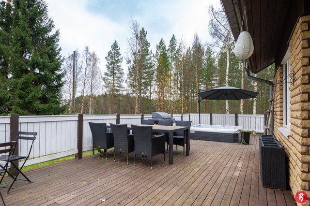 Pihapiiri on suuri ja vehreä, ja tilava terassi poreammeineen kutsuu nauttimaan ulkoilmasta. Autokatos ja varasto tarjoavat lisätilaa säilytykseen.