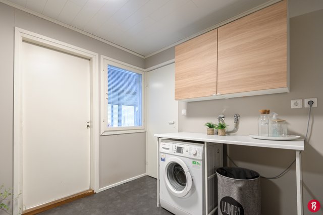 - Pesukoneliitäntä, pöytätaso, ja kaapit