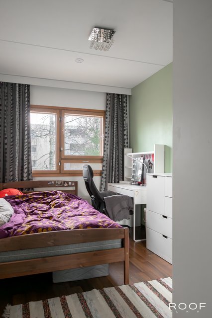 - Asunnossa on useampi makuuhuone, jotka ovat valoisia ja selkeän muotoisia. Huoneet soveltuvat hyvin makuuhuoneiksi, työ tai lastenhuoneiksi, ja ne ovat helposti kalustettavissa eri tarpeisiin.