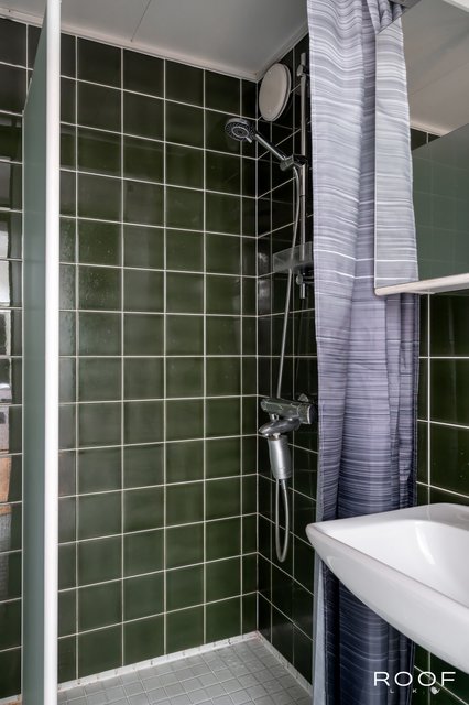- Pesutila on tilava ja selkeä. Kylpyhuoneessa on suihku ja wc samassa tilassa, ja laatoitetut pinnat ovat helppohoitoiset.