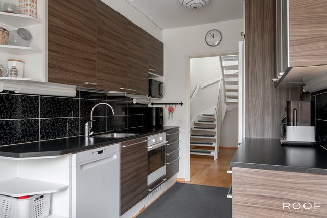 - Keittiö on tilava ja hyvin varusteltu kokonaisuus, jossa on runsaasti työ- ja säilytystilaa. Tumma kaapisto ja yhtenäinen työtaso luovat modernin ja ajattoman ilmeen. Keittiö on toiminnallisesti suunniteltu ja soveltuu hyvin myös vaativampaan ruoanlaittoon.