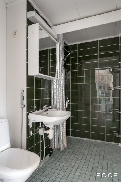 - WC-istuin, suihku, pesukoneliitäntä, pesuallas, peilikaappi, ja lattialämmitys