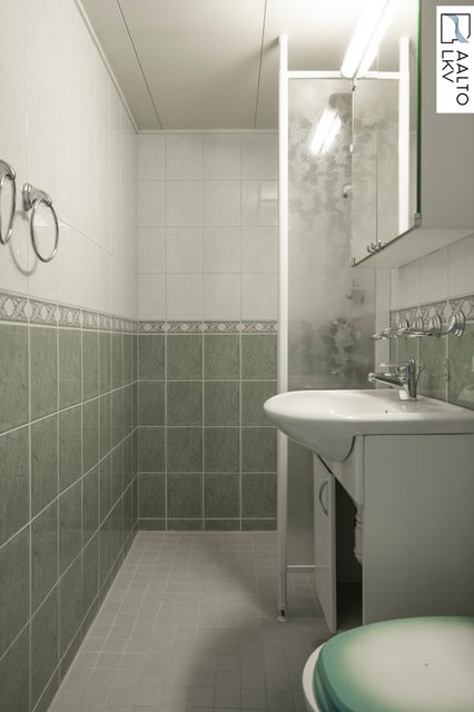 - WC-istuin, suihku, suihkuseinä, pesuallas, allaskaappi, peilikaappi, ja pesukoneliitäntä