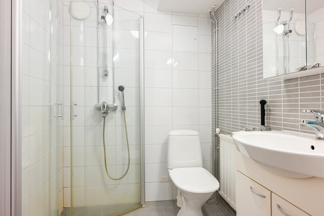 - WC-istuin, suihku, pesukoneliitäntä, peili, pesuallas, ja allaskaappi