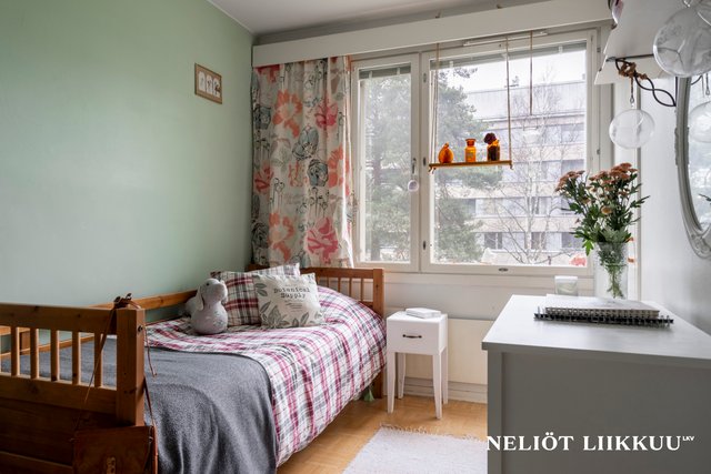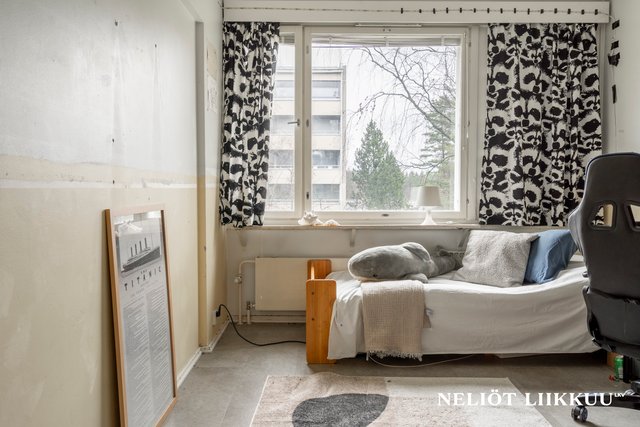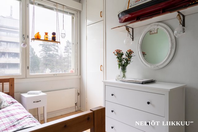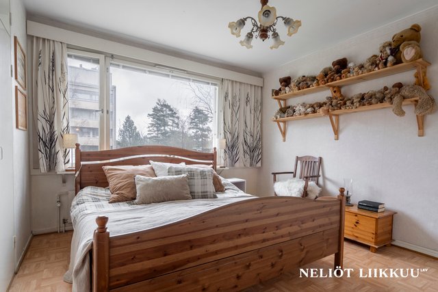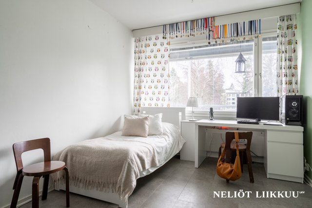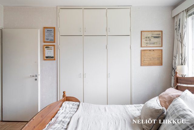 - Neljä makuuhuonetta, isot ikkunat, kaapistot/vaatehuone, seinät maalattu, kahdessa laminaattilattiat, muissa parkettikuvioinen muovimatto.