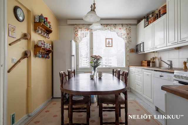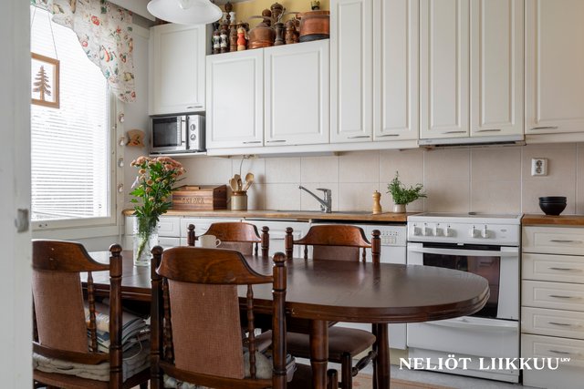 - Erillinen keittiö, hyvä tila ruokailuryhmälle, täysikorkeat jääkaappi ja pakastin, astianpesukone, sähköliesi keraamisella tasolla. valkoiset kaapistot, jossa paikka mikrolle, työtasot puuta, välitila laatoitettu, lattialla muovimatto