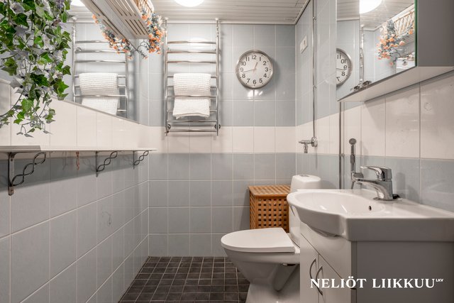 - 2011 linjasaneerauksessa uusittu, laatoitettu kph, jolloin wc ja suihkutila yhdistetty yhdeksi tilaksi. suihku, käsienpesuallas kaapistolla, peilikaappi, peili, pyyhekuivauspatteri, wc-istuin, bide-suihku, pesukoneliitäntä