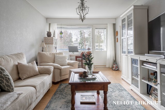 - Olohuone on tämän kodin keskus, josta käynti myös lasitetulle parvekkeelle, seinät maalattu, lattialla parkettikuvioinen muovimatto