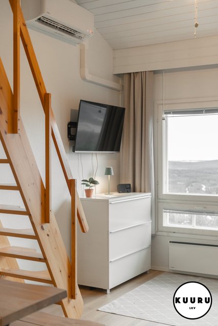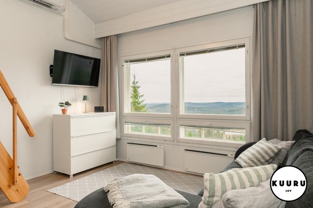 Huoneiston ikkunoista avautuu upeat maisemat aina kilometrien päähän pitkälle kauniiseen tunturiluontoon.