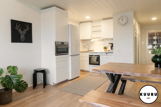 - Vuonna 2018 täysin uudistettu loma-asunnon keittiö avautuu luontevasti olohuoneen ja ruokailutilan yhteyteen. Selkeä ja tehokas pohjaratkaisu tekee kokkailusta sujuvaa ja pitää kaiken tarvittavan helposti ulottuvilla. Yhteinen tila kutsuu seurustelemaan kokin ympärille ja jatkamaan illanviettoa pöydän ääressä. Hillitty ilme sopii mainiosti rentoon lomatunnelmaan.