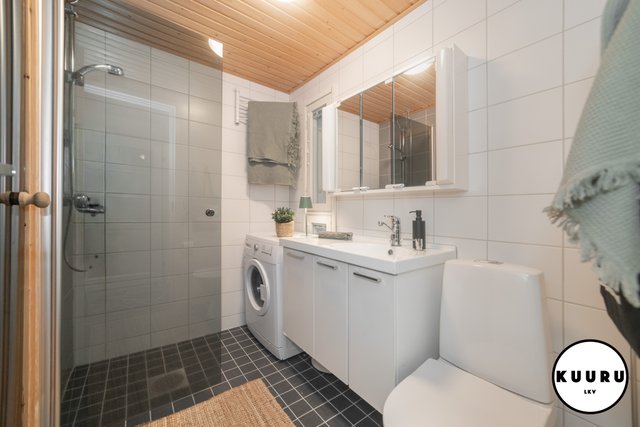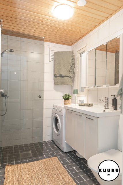 - Kauniisti 2010-luvulla remontoitu, vaaleasävyinen pesuhuone ja sauna muodostavat rauhallisen keitaan aktiivisen ulkoilupäivän päätteeksi. Selkeä ja toimiva asettelu tekee arjen rutiineista mutkattomia.