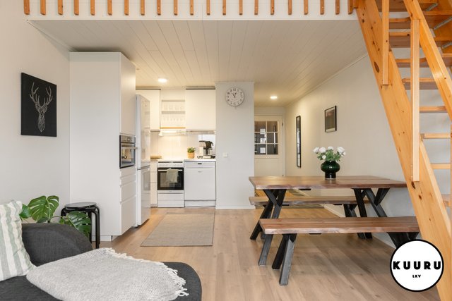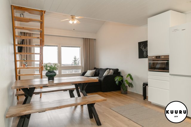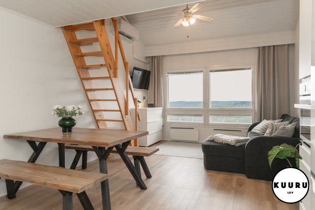 Huoneiston avara ja valoisa olohuone ja avokeittiö ruokailutiloineen kylpee auringonvalossa sekä ikkunoista avautuvat henkeäsalpaavan upeat maisemat värjäytyvät vuodenaikojen mukaan luoden kuvankauniin maiseman. Vuonna 2018 remontoitu keittiö tarjoaa miellyttävät puitteet kokkailuun yhdessä perheen ja ystävien kanssa. Yhtenäisen tilan kruunaa korkea huonekorkeus joka luo mukavasti avaruutta sekä tilantuntua.