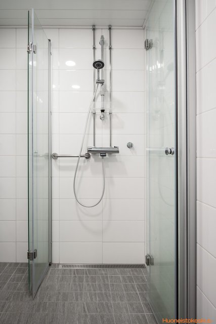 - Suihku, kääntyvät suihkuseinät, peilikaappi, allaslaatikosto, pesukoneliitäntä ja wc-istuin. Lattia laattaa, seinissä kaakelia.