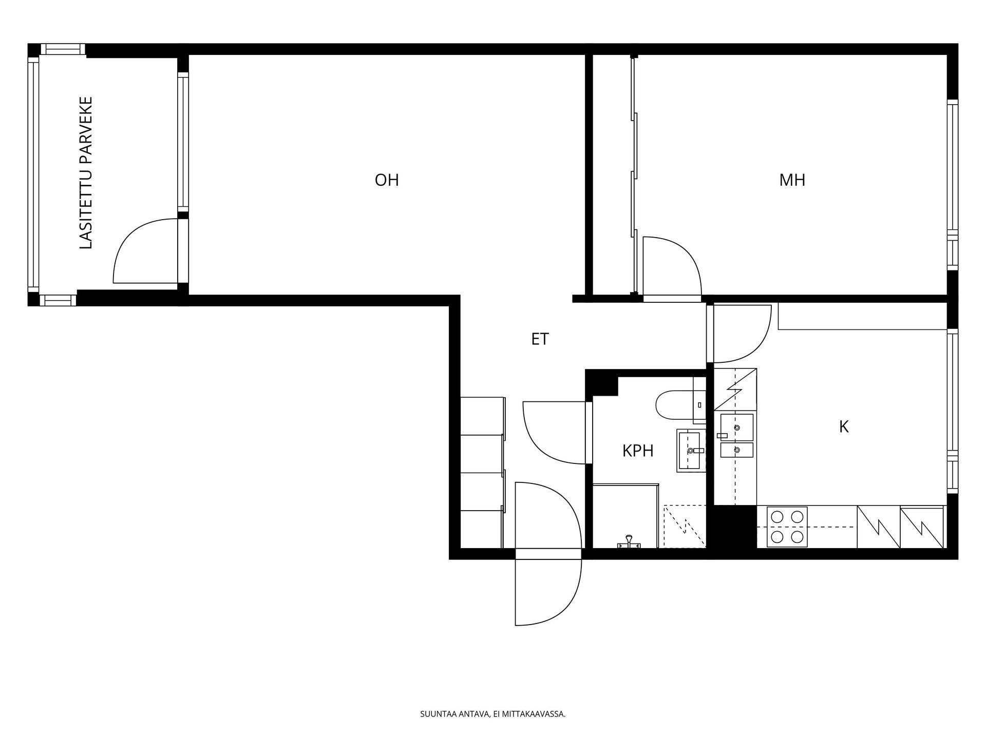 Asunnossa on toimiva pohja ja läpitalonhuoneiston ikkunat tuovat runsaasti valoa ja korostavat avaruutta ja viihtyisyyttä. Remontoitu keittiö on tilava, siellä on kaikki nykyaikaiset kodinkoneet, runsaasti kaappitilaa ja laskutasoa. Olohuone on tilava ja sieltä on käynti lasitetulle parvekkeelle. Asunnon reilun kokoinen kylpyhuone on remontoitu linjasaneerauksen yhteydessä.