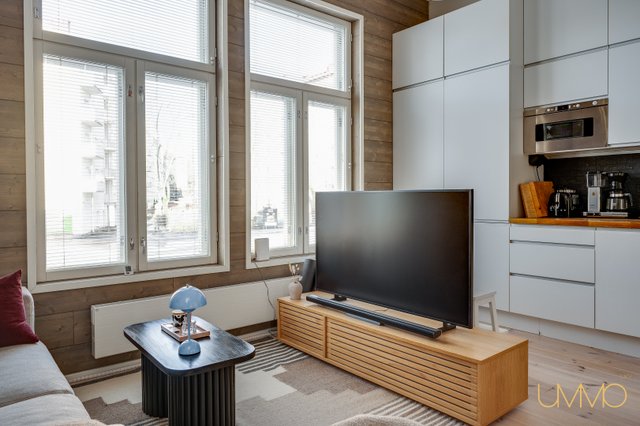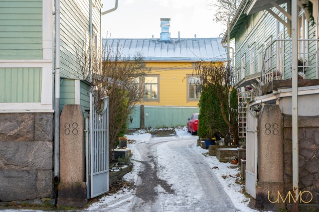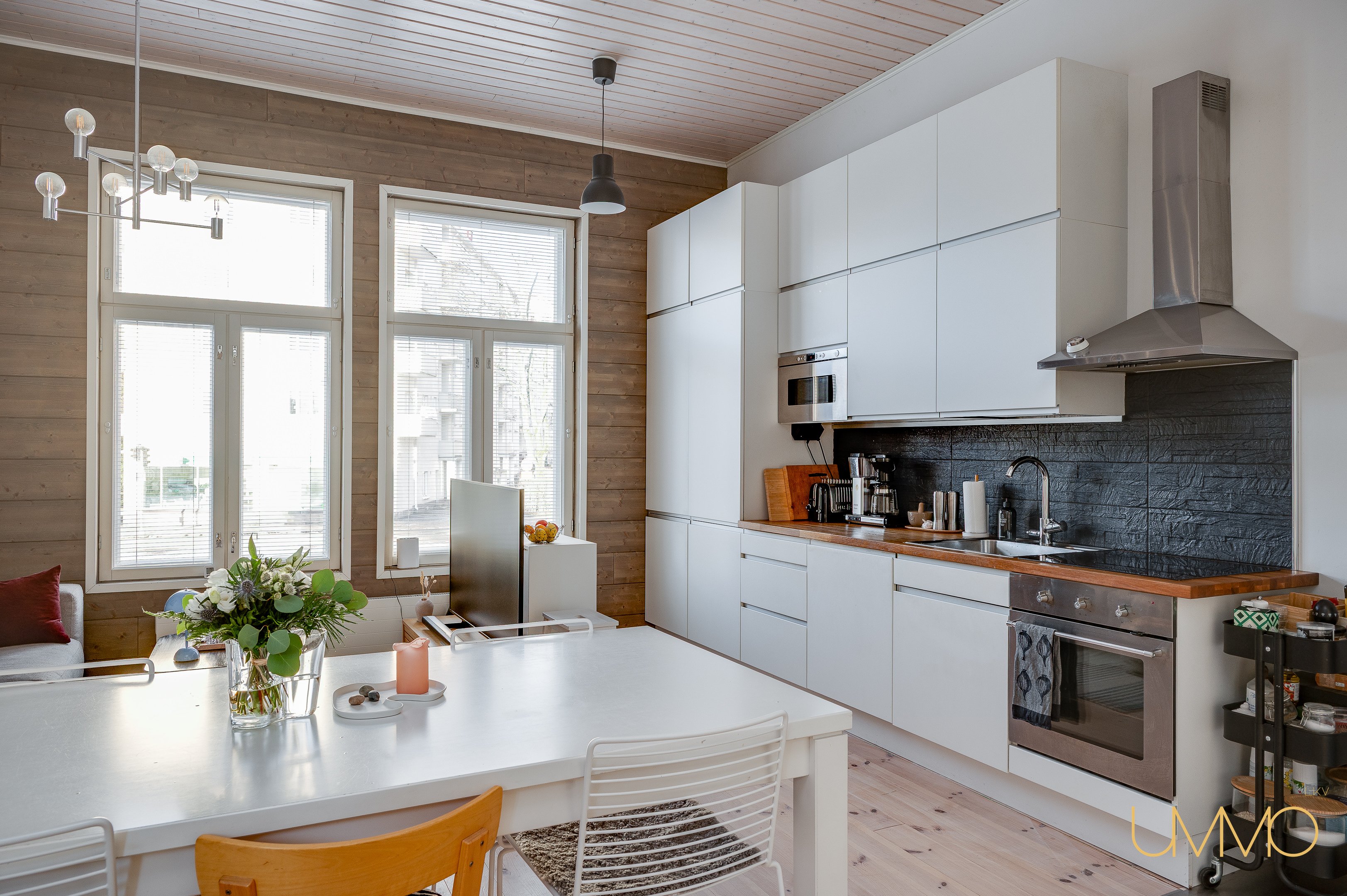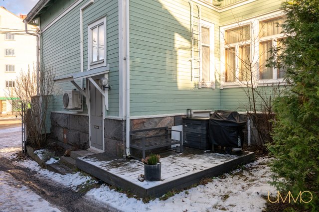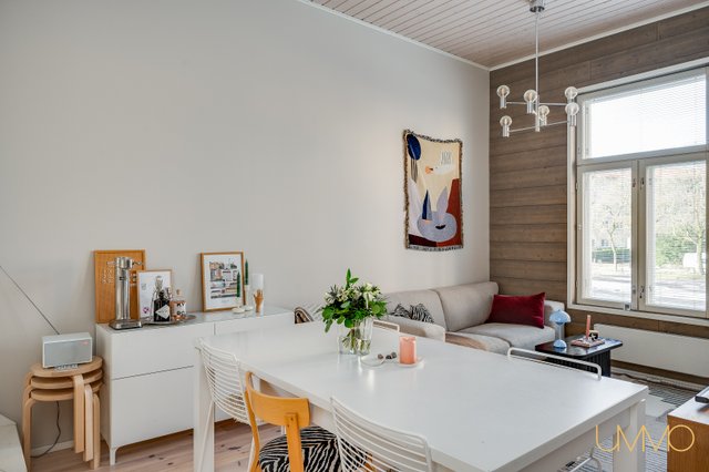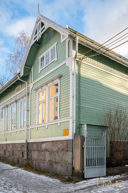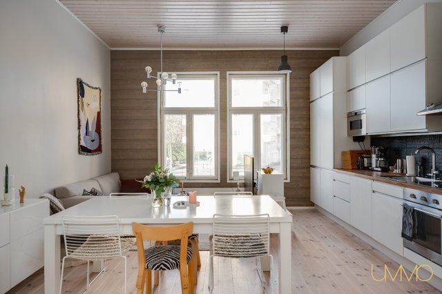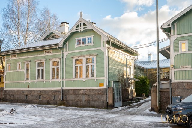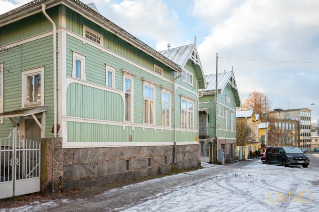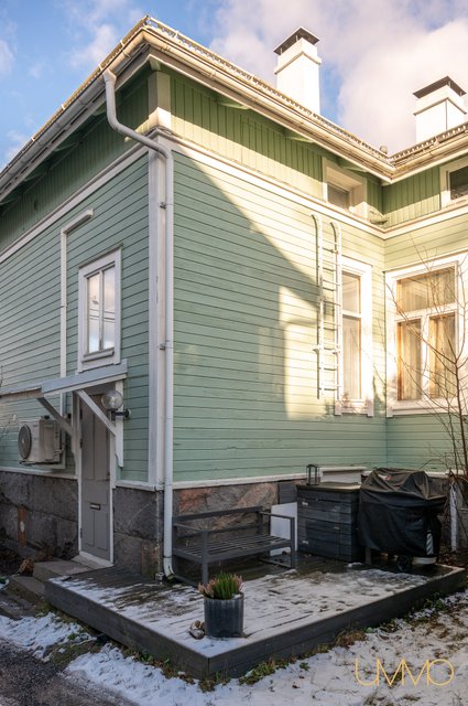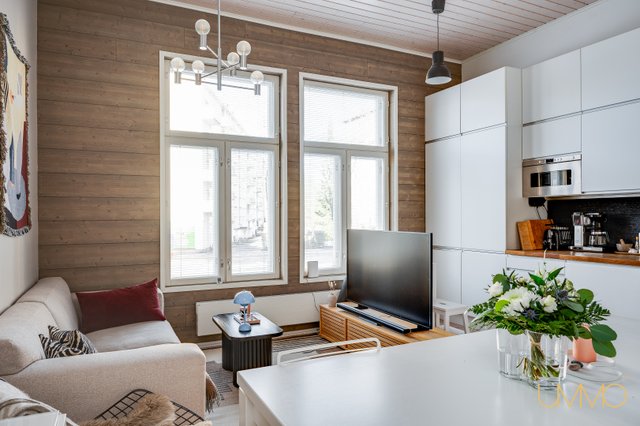 Vuonna 1912 valmistunut puutalo huokuu historiaa ja tarjoaa kodikasta tunnelmaa. Kodikas tunnelma valtaa sydämen heti kun astut asuntoon sisälle. Asunnossa on avokeittiö, joka on varustettu nykyaikaisilla laitteilla, ja tilava olohuone, johon tulvii luonnonvaloa. Saat sijoitettu ruokailuryhmän järkevästi keittiön yhteyteen, jossa pystyt viettämään lukuisia iltoja läheisten seurassa. Keskikerroksesta löytyy myös erillinen wc, jossa lisämukavuutta tuo lattialämmitys.
