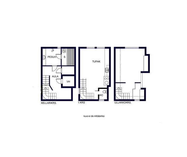 - Virallinen huoneistoselitelmä on asuinkeittiö. Yhtiöjärjestyksen ja isännöitsijäntodistuksen mukainen pinta-ala on 25m2. Ilmoitettu pinta-ala on kokonaisalaa. Pinta-aloja ei ole tarkistusmitattu, joten ne saattavat olla ilmoitettua suuremmat tai pienemmät. Kohteen kauppahinta ei ole pinta-ala perusteinen, vaan kohde myydään kokonaisuutena. Osa yläkerran pinta-alasta on alle 160cm tilaa, ja kellaritilat eivät täytä huoneistoselitelmän vaatimuksia liian vähäisen ikkunapinta-alan vuoksi.