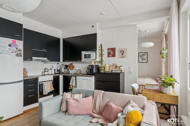 Asunnon pohjaratkaisu on toimiva ja arkea helpottava. Keittiö ja oleskelutila muodostavat luontevan kokonaisuuden, jossa on helppo viihtyä . Kylpyhuone on moderni sekä käytännöllinen. Erillinen makuualkovi toimii kuten makuuhuonekin ja liukuovella saat myös yksityisyyttä.