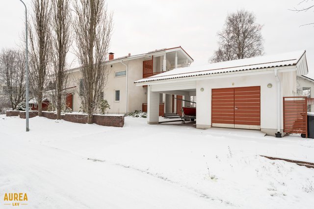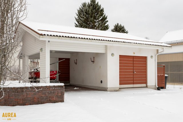 - Erillisessä rakennuksessa autotalli, joka on lämpöeristetty sekä varasto ja puuvarasto. Autokatoksen yhteydessä on pyöräkatos.