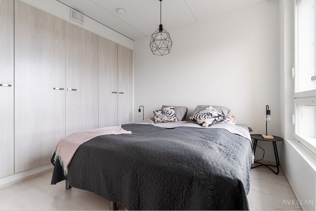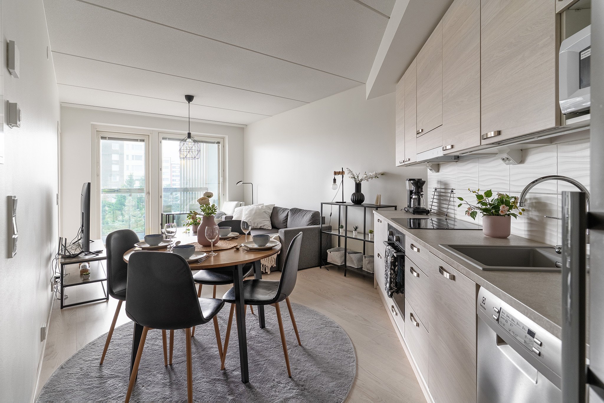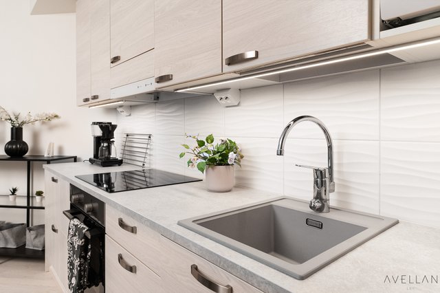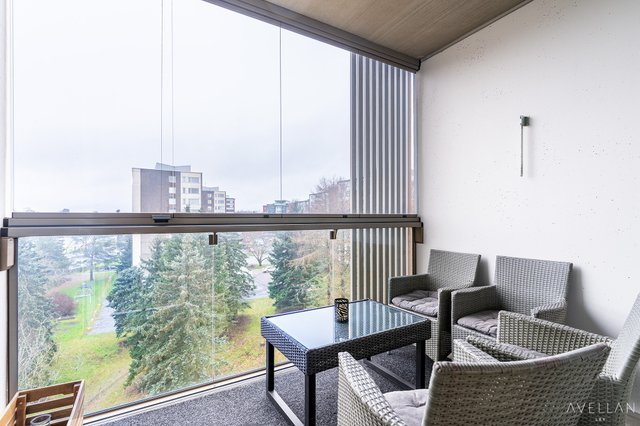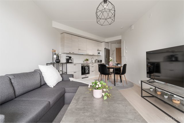 Asunnon olohuone-keittiö yhdistelmä avautuu lasitetulle länsiparvekkeelle, jossa voit nauttia ilta-auringosta. Keittiö on tyylikäs ja käytännöllinen, varustettuna rosterin värisillä kodinkoneilla ja vaaleilla pintamateriaaleilla. Makuuhuoneen parkettilattiat ja maalatut seinät luovat viihtyisän tunnelman, ja oma sauna tuo arkeen ripauksen luksusta.