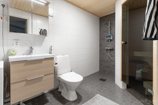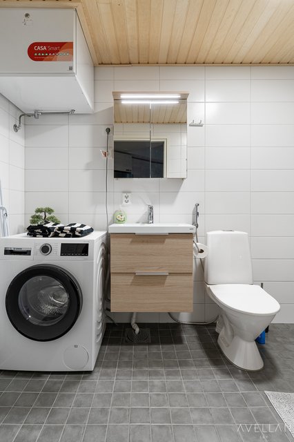 - WC-istuin, suihku, pesukoneliitäntä, lattialämmitys, peilikaappi, ja allaskaappi