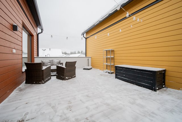 Yläkerrassa sijaitsevissa oleskelutiloissa on valoisaa ja avaraa sekä tavanomaista korkeampi huonekorkeus. Keittiö, ruokailutila ja olohuone muodostavat selkeän, kuitenkin yhtenäisen kokonaisuuden. Olohuoneesta on käynti tilavalle kattoterassille, jossa on yksityisyyttä oleskella.