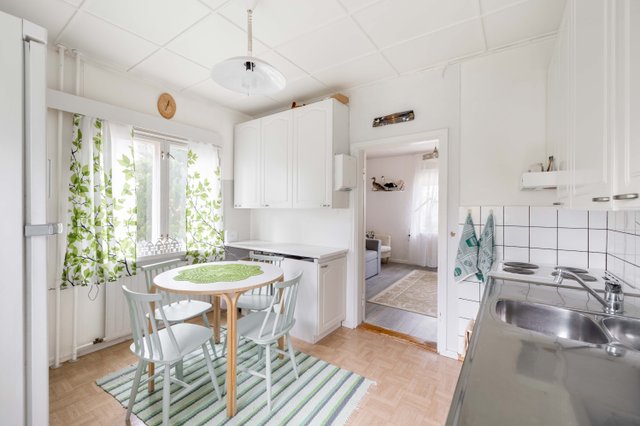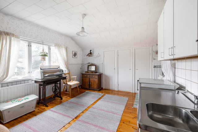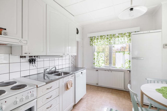 - Keittiön kaapistot: valkoiset Keittiön välitila: valkoinen laatta Keittokomero yläkerran huoneessa (pieni jääkaappi, allas, taso)