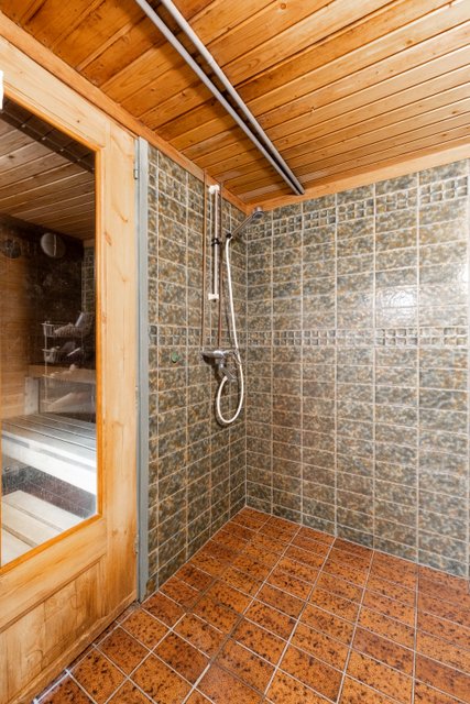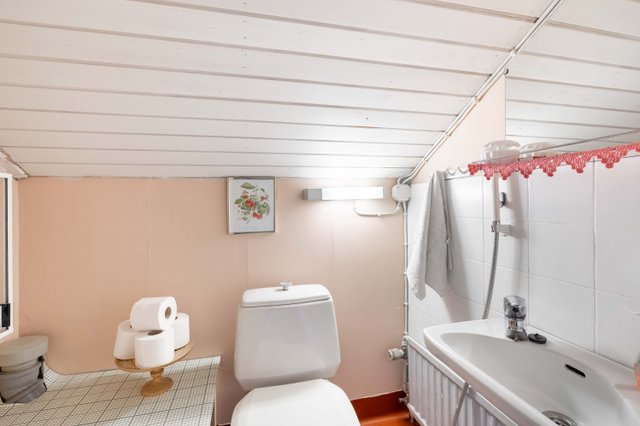 - Keskikerroksen wc:n seinät ja lattia: laatta Yläkerran wc:n lattia: muovimatto, seinät: laatta/tapetti