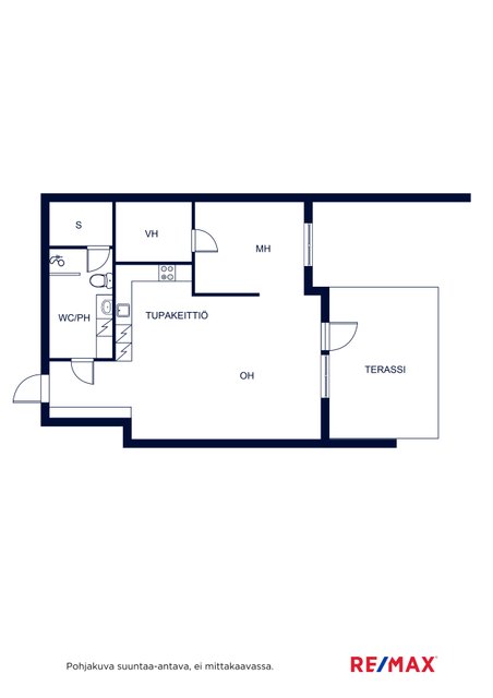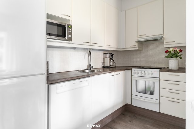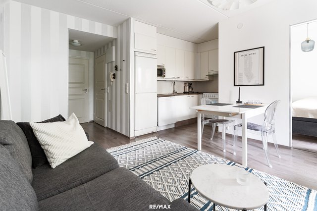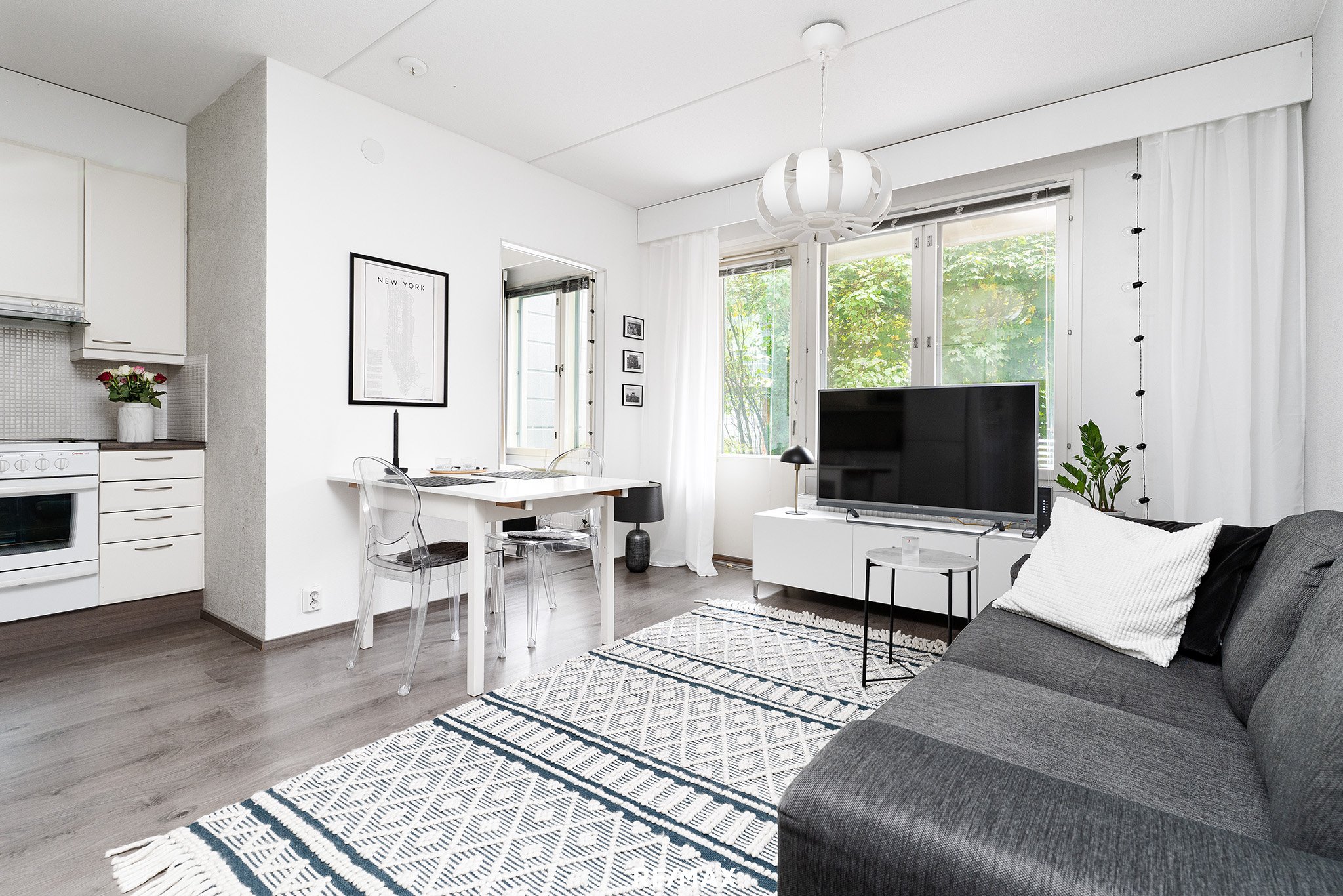 Asunnon tupakeittiö on varustettu nykyaikaisilla kodinkoneilla ja yhdistyy kivasti olohuoneen kanssa. Erillisessä makuuhuoneessa on säilytystilana käytännöllinen vaatehuone. Kylpyhuoneessa on tyylikkäät laatta- ja kaakelipinnat, mukavuutena on lattialämmitys ja kokonaisuuden kruunaa oma sauna.