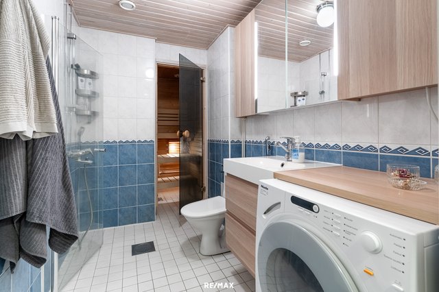 - Lattiamateriaali laatta, seinät kaakeloitu. Varustuksena wc-istuin, pidee-suihku, suihku, taittuva suihkuseinä, allaslaatikosto, peilikaappi, pesukoneliitäntä ja lattialämmitys.